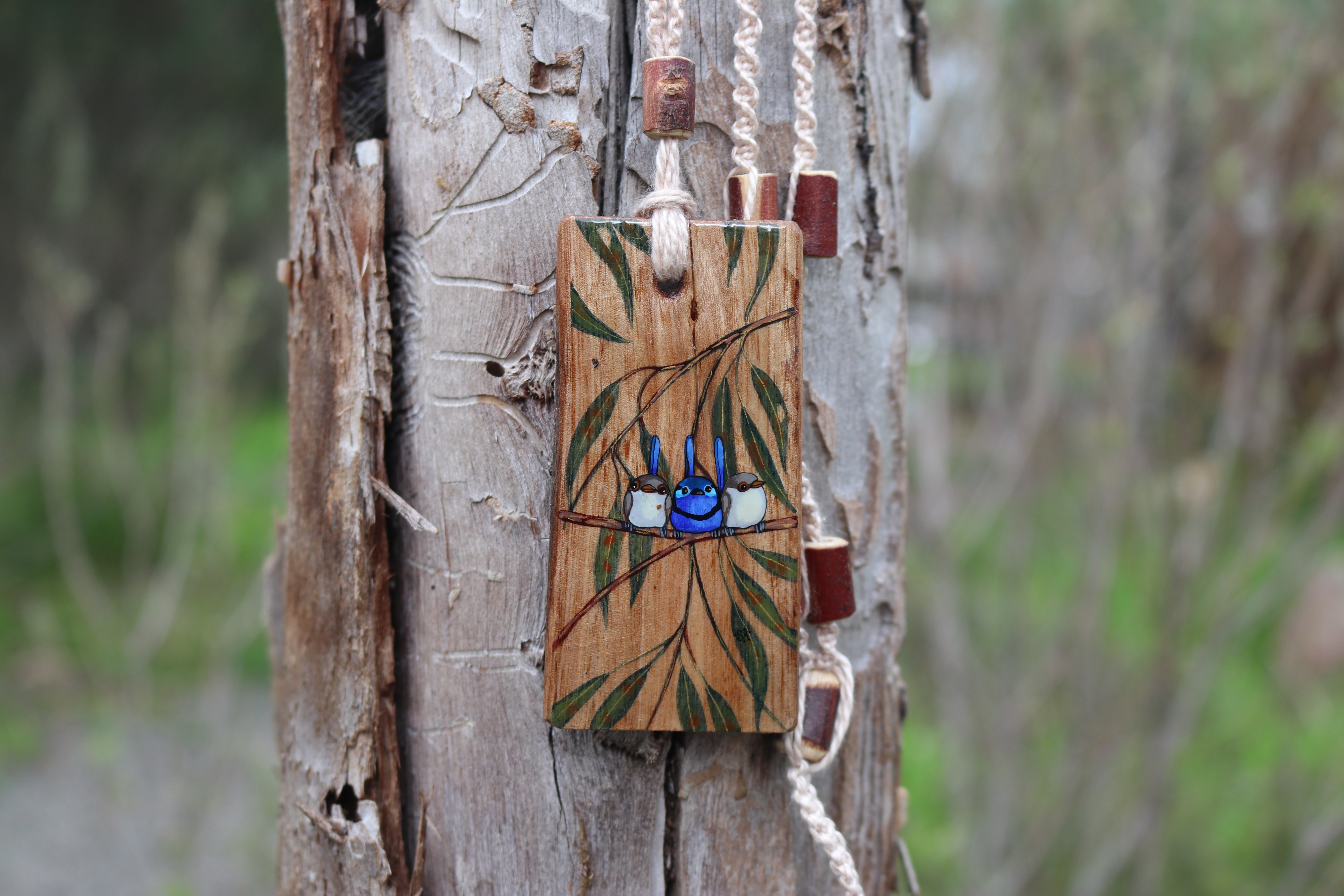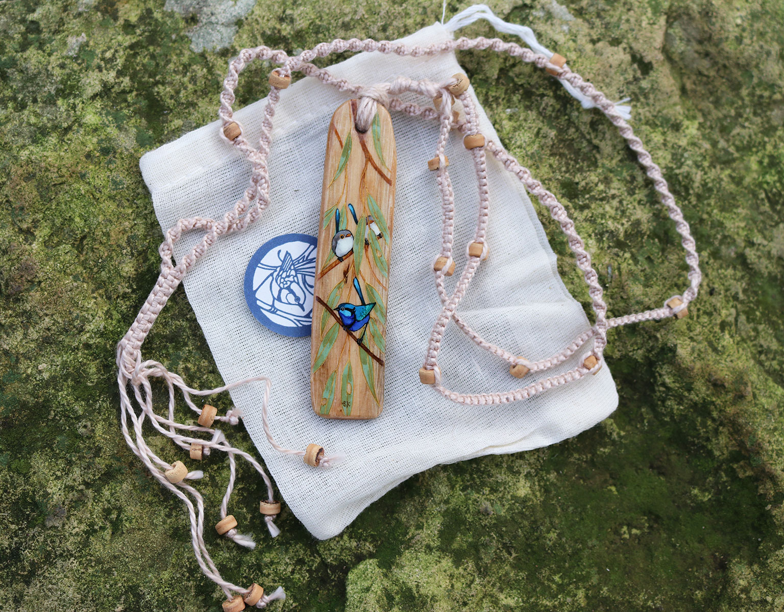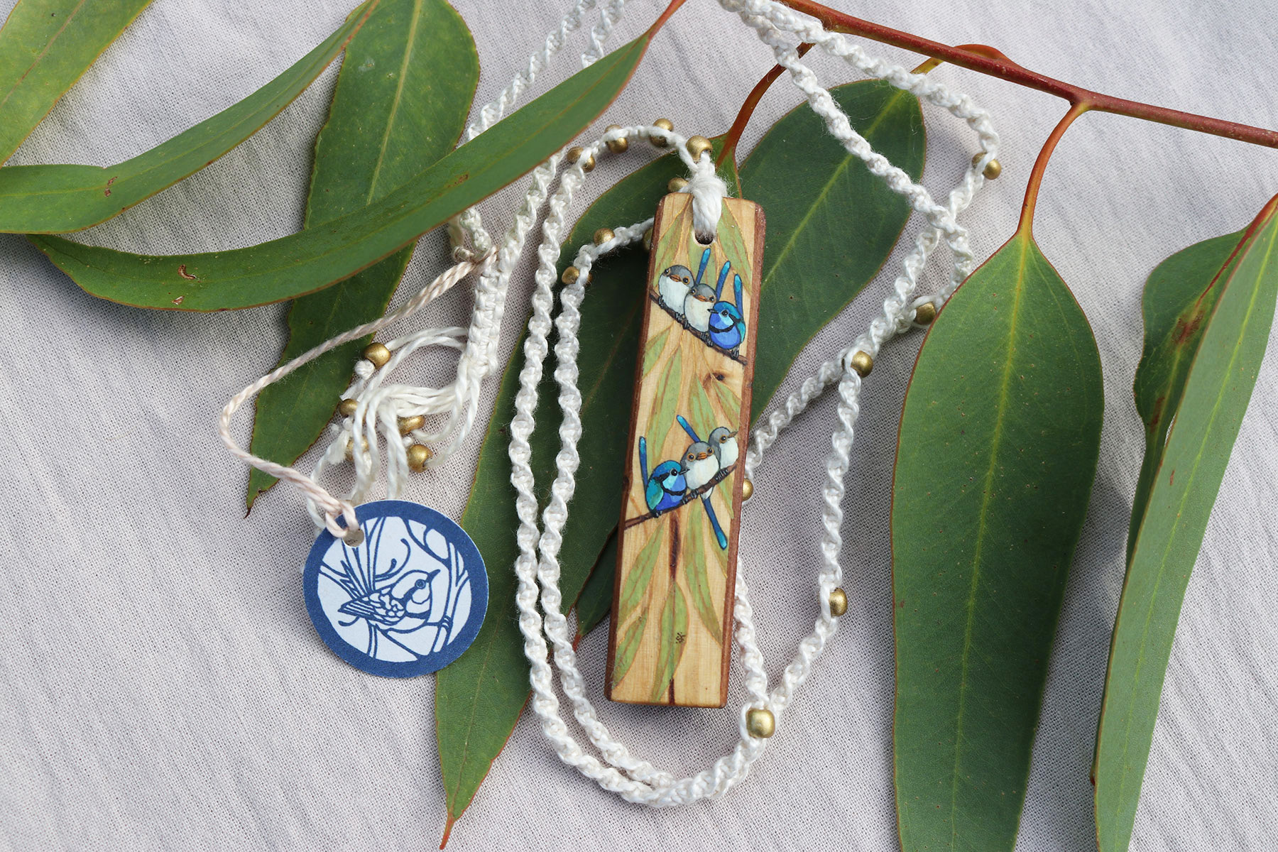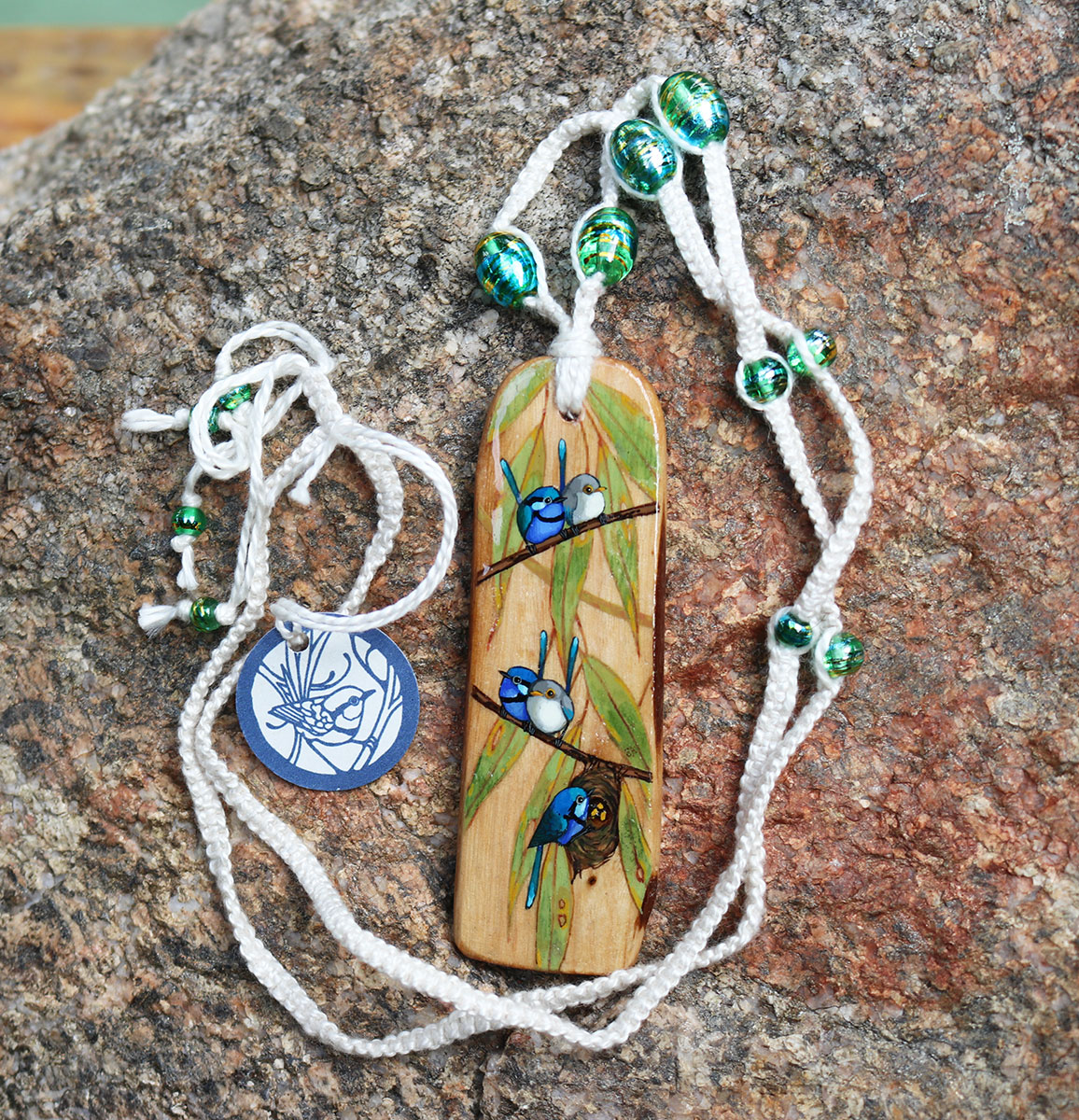 Each pendant is made from fallen timber collected on my rural bush property. They are carefully shaped, sanded and intricately painted by hand. The artwork is then sealed with tung oil and allowed to dry for a month. The necklaces are macrame knotted pure cotton thread, with either bush twig beads or glass beads. Wildwood Pendants are little expressions of my view of the birds that inhabit the land around me. The entire process, from collecting the wood, refining and sanding to painting, brings me great joy.
