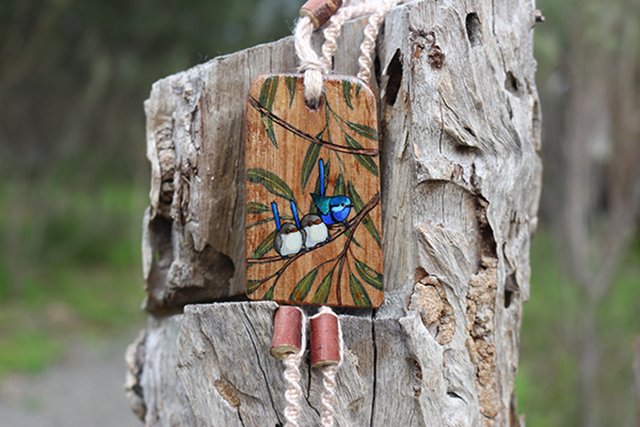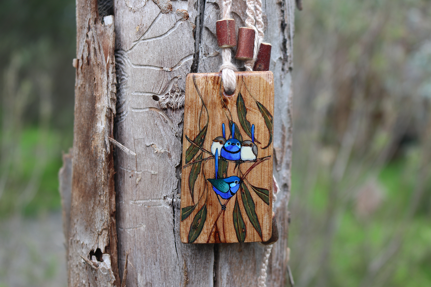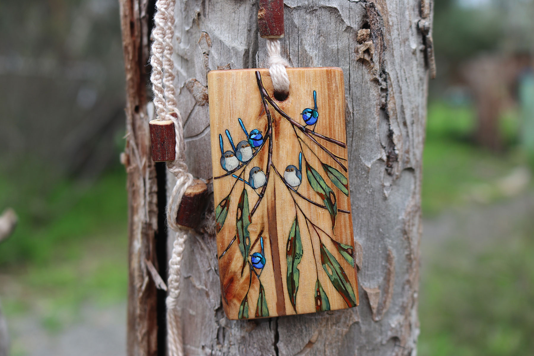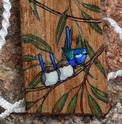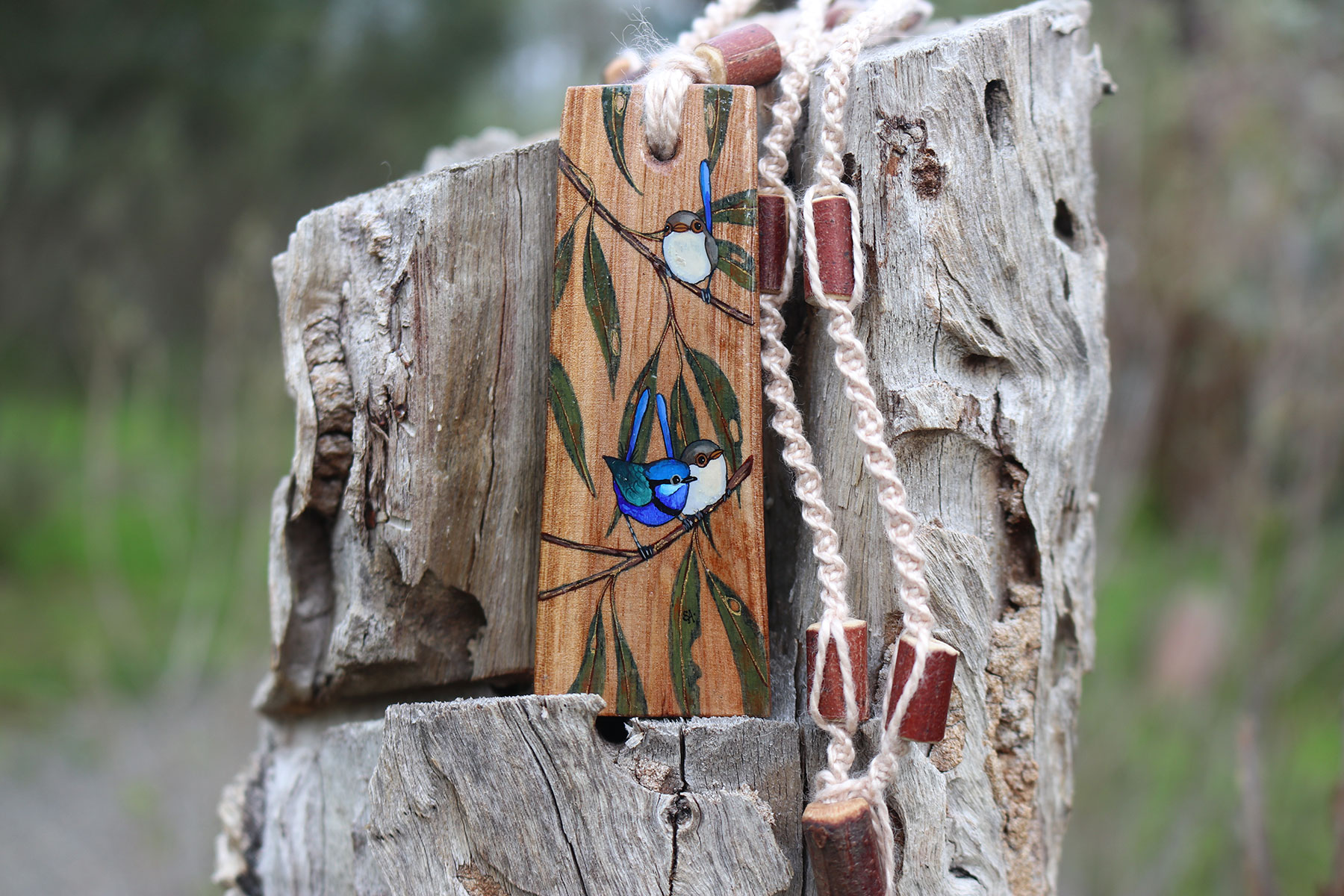 Each pendant is made from fallen timber collected on my rural bush property. They are carefully shaped, sanded and intricately painted by hand. The artwork is then sealed with tung oil and allowed to dry for a month. The necklaces are macrame knotted pure cotton thread, with either bush twig beads or glass beads. Wildwood Pendants are little expressions of my view of the birds that inhabit the land around me. The entire process, from collecting the wood, refining and sanding to painting, brings me great joy.